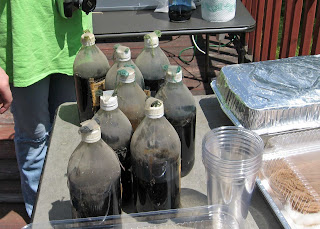 See those disposable metal pans? They really work great. Most everyone eventually decided it was better though to actually use the lids, which were plastic and not the bendy metal. The fiber was laid out in the plastic lids, the dye was placed on the fiber and then the metal could be placed over that during the warming period.It was a bright sunny day, and since cotton only needs to be held just slightly warmer than body heat for 30 minutes, we found that just leaving the pans covered, out in the sun, did the trick. But we also did use the warmer rigged up by Anita.